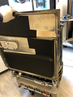 Retirez les 6 vis (3 à gauche et 3 à droite) et débranchez toutes les connexions et le faisceau des prises avant de retirer la partie supérieure de la porte où se trouve le panneau de commande.