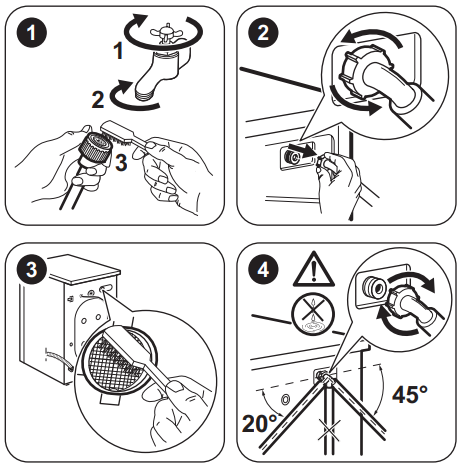 - Vérifiez que les filtres du tuyau d'alimentation et de la vanne d'eau sont propres (à l'endroit où le tuyau d'alimentation est vissé sur l'appareil et au niveau du robinet).