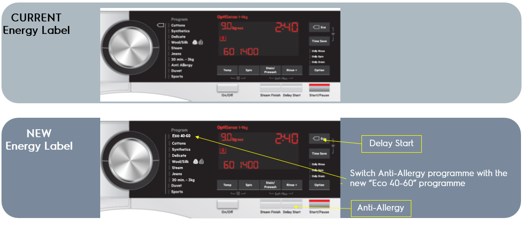- Les modifications apportées au bandeau de commande sont liées à l'ajout du programme obligatoire eco 40-60. Pour ce faire, nous avons dû déplacer certains programmes / options: le programme anti-allergie a été déplacé au niveau de la touche Départ différé, qui elle, a été déplacée au niveau de la touche d'option Eco. Aucun programme n'est retiré, le programme éco étant remplacé par un autre.